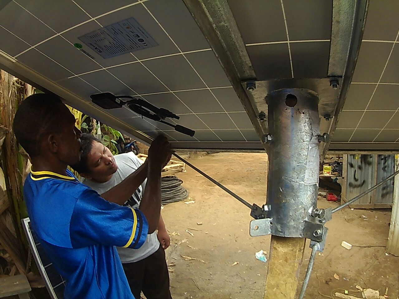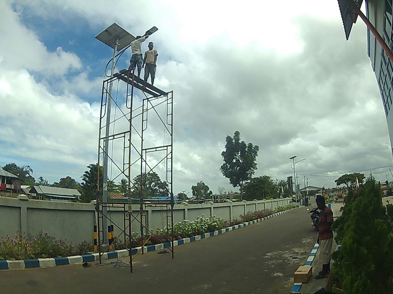Proses pengerjaan pemasangan tiang penyangga untuk panel surya di Bandara Merauke Papua. Recanannya panel solar ini difungsikan sebagai lampu penerangan jalan dan diharapkan jalan disekitar Bandara Merauke mendapatkan penerangan yang baik pada waktu malam hari.